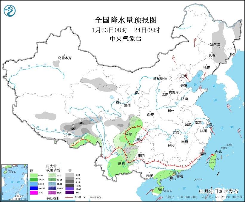 1月25日08时至26日08时,西藏东部、青海南部、甘肃南部、川西高原北部、四川南部、贵州西部、云南东北部和西北部等地部分地区有小到中雪或雨夹雪。云南大部、贵州西南部等地部分地区有小到中雨(见图5)。