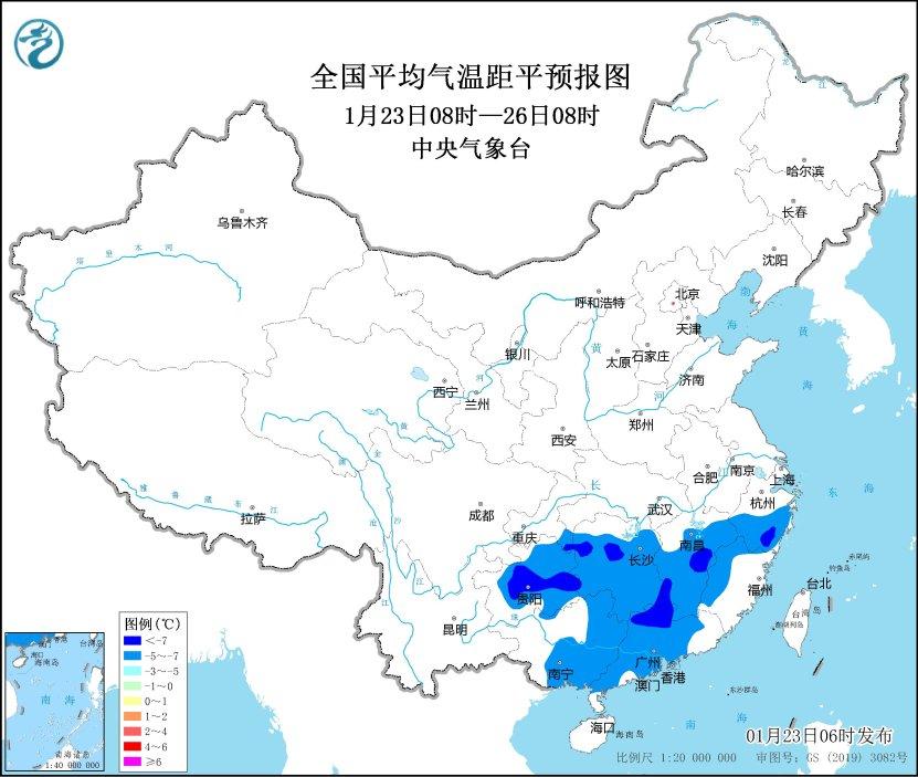 预计,1月23日至25日,贵州、湖南、江西、浙江中南部、福建西部、广东、广西中东部等地最低气温或平均气温较历史同期偏低5℃以上,其中,贵州中东部、湖南西北部、江西中南部、浙江南部、广东西北部等地的部分地区偏低7℃以上,最低气温0℃线将位于广西北部、广东北部一带。中央气象台1月23日06时继续发布低温蓝色预警。
