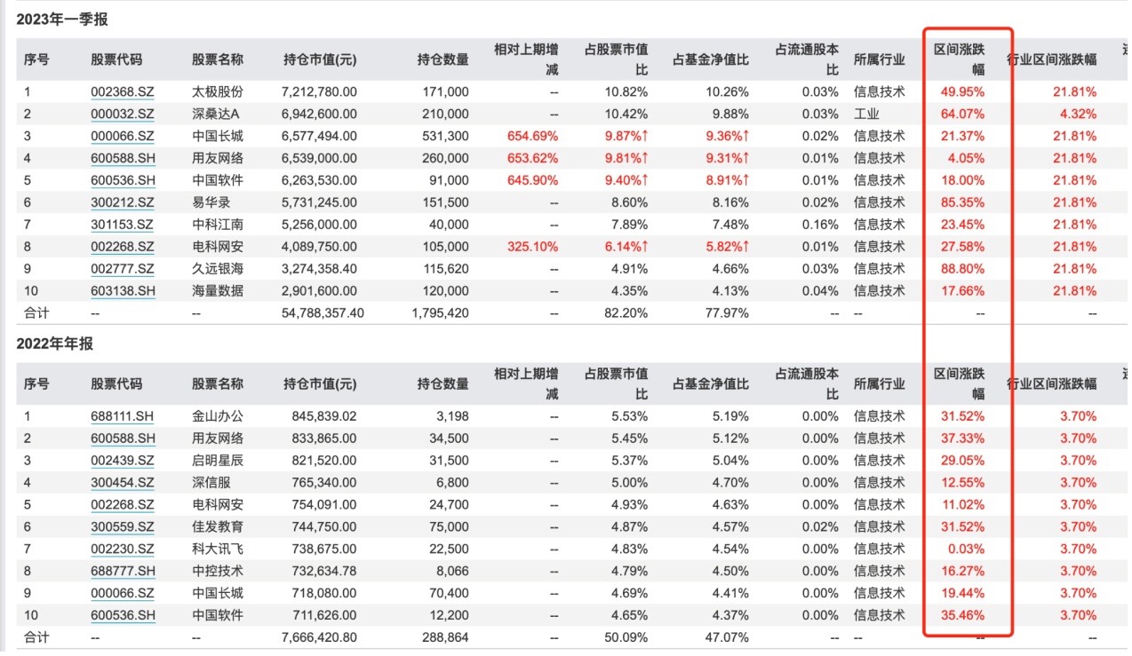 这位热点切换的高手,堪称调仓的节奏大师。从他近一年的操作来看,2022年四季度、2023年一季度全仓TMT,精准踩对了行业轮动,两个季度前十大重仓股收益率全部为正。