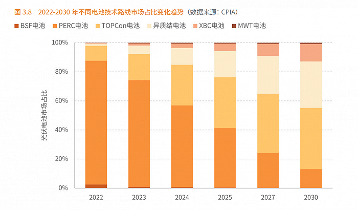 对于目前的光伏技术趋势,鲁玺也在发布会上给出预测:“到2030年,TopCon和异质结电池技术的市场占比有望从2022年的11.8%提升到74%,成为主流的光伏技术产品。钙钛矿与硅电池结合形成的叠层电池,也是未来钙钛矿电池技术发展的一个方向,它的转换效率有望大幅提高到35%。”