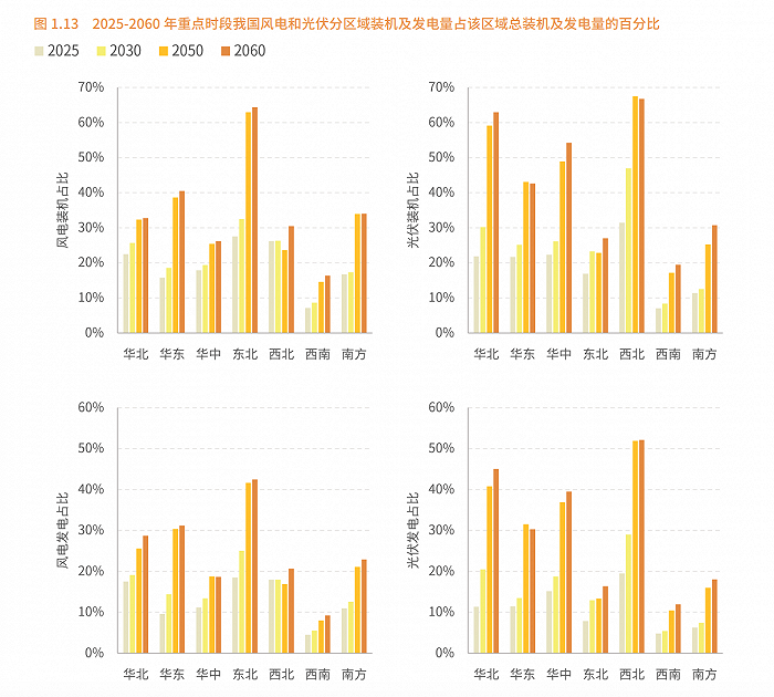 报告预测,到2060年,东北地区将以风力发电为主,风电装机占该地区电源装机的60%以上,主要原因在于太阳辐射有限但风力资源丰富。华北、西北太阳能和陆上风能资源都丰富,届时预计60%的电源装机量将来自太阳能装机,30%来自风电装机。