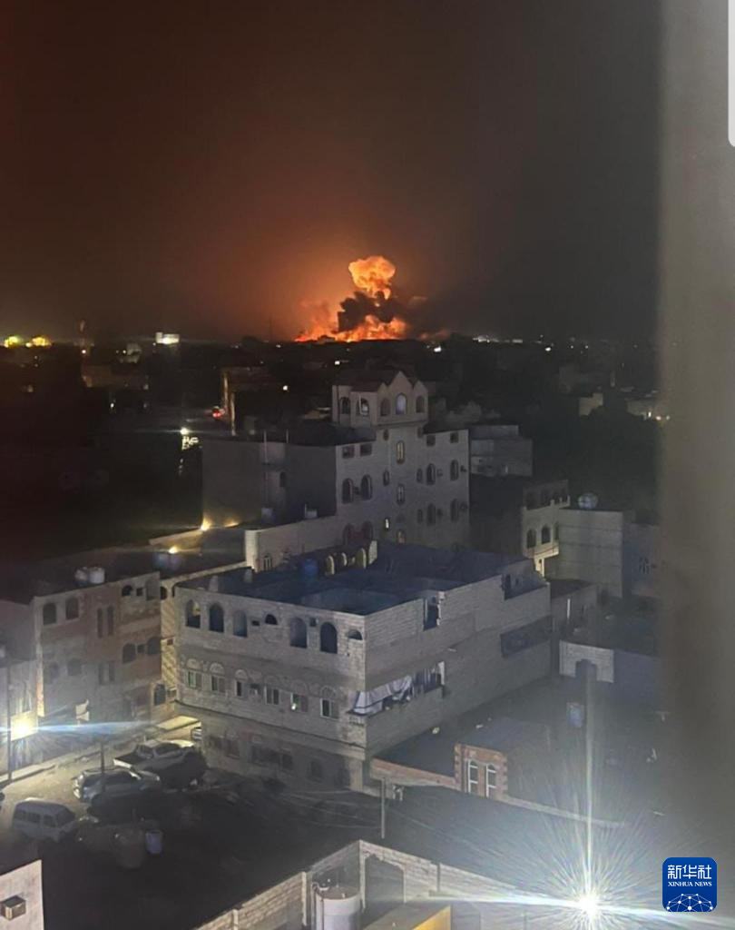 这是1月12日在也门首都萨那拍摄的空袭后的爆炸画面(手机照片)。据也门萨巴通讯社12日报道,美国和英国的战机在当地时间12日凌晨空袭了也门首都萨那、西部红海城市荷台达和北部萨达省内的多处目标。新华社发