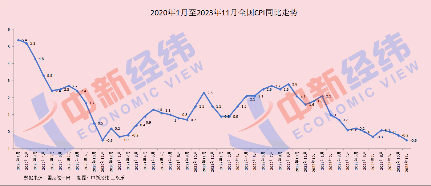 国家统计局数据显示,2023年11月,全国CPI环比下降0.5%,同比下降0.5%。CPI同比连续两月处于负值区间,且二次探底,创2020年12月以来最大降幅。