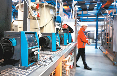 2023年11月14日,在法国特拉普一家电动汽车电池回收工厂,一名工程师走过电池回收装置。