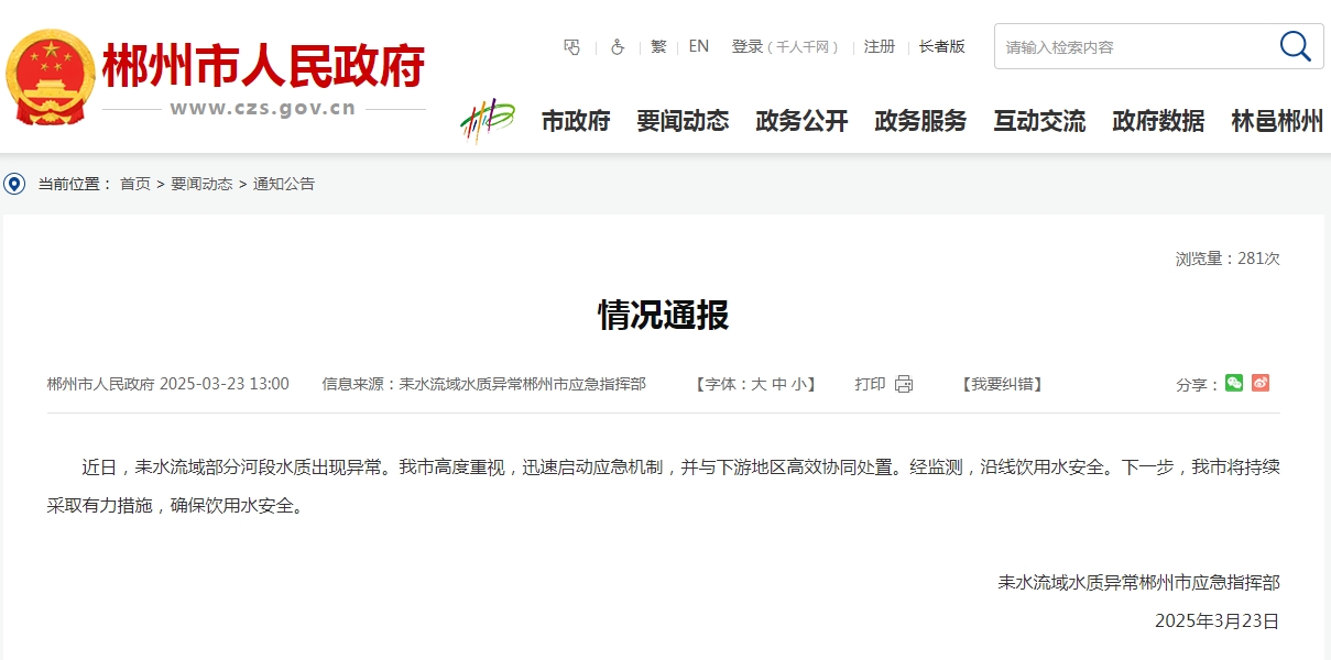 据湖南省郴州市人民政府官网消息,耒水流域水质异常郴州市应急指挥部23日发布情况通报称,近日,耒水流域部分河段水质出现异常。郴州市高度重视,迅速启动应急机制,并与下游地区高效协同处置。经监测,沿线饮用水安全。下一步,郴州市将持续采取有力措施,确保饮用水安全。