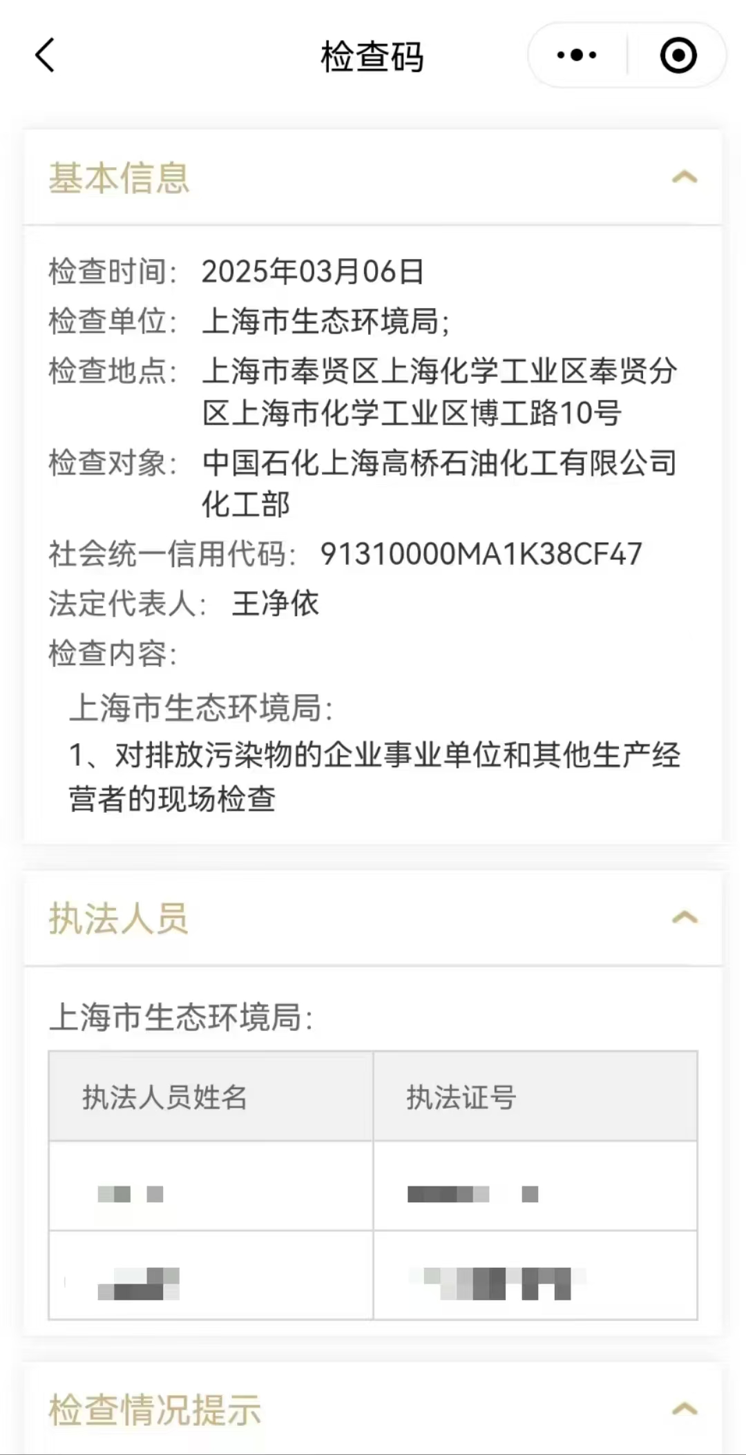 在上海化工区高桥石化公司,企业负责人扫码,就能看到当天有8项检查任务,涉及地下水、废气排放等。“像今天这么多检查事项,以往至少要来检查3次,现在1次就完成了,我们可以有更多精力投入到安全生产中。”企业负责人表示。