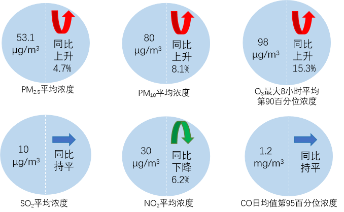 1月,全国339个地级及以上城市PM2.5平均浓度为53.1微克/立方米,同比上升4.7%;PM10平均浓度为80微克/立方米,同比上升8.1%;O3平均浓度为98微克/立方米,同比上升15.3%;SO2平均浓度为10微克/立方米,同比持平;NO2平均浓度为30微克/立方米,同比下降6.2%;CO平均浓度为1.2毫克/立方米,同比持平。