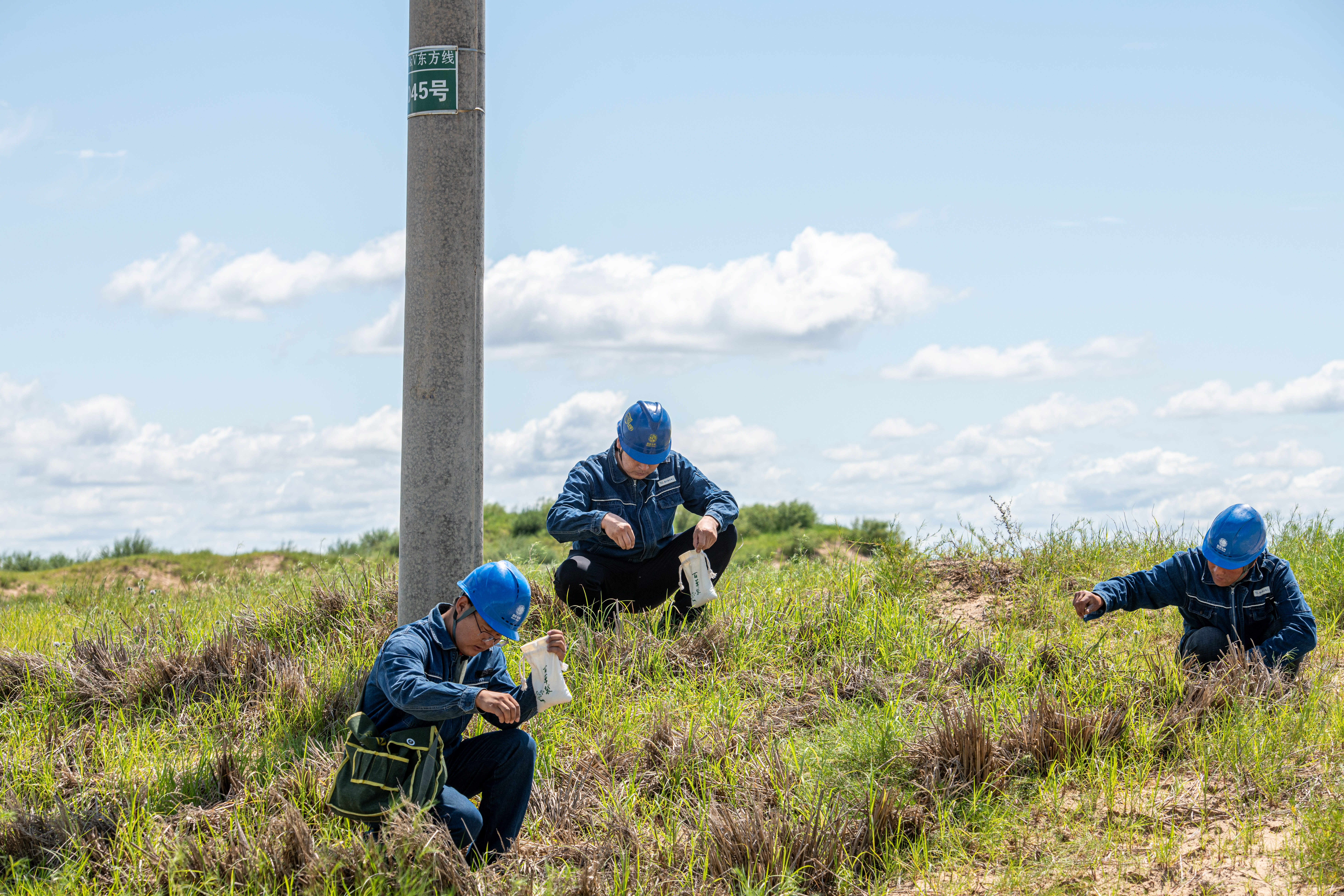 国网蒙东电力供电员工在巡线、检修时根据季节携带沙棘、沙打旺等乡土耐旱植物草籽沿输电线路播撒种植,同时以麦草扎制的草方格锁住流动沙丘,对杆塔基础进行防冲刷加固,使“巡线路”变为“种草路”“固沙路”。