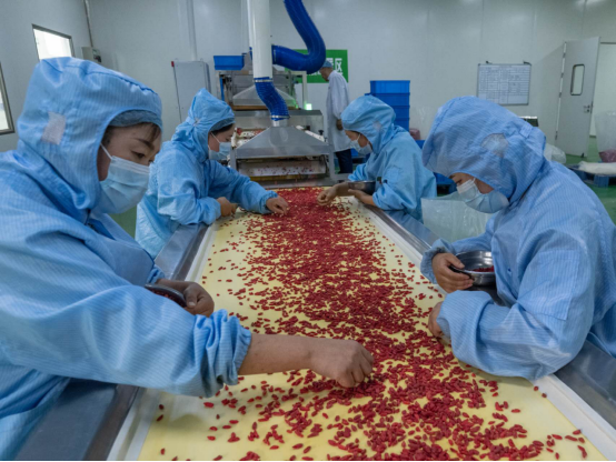 ▲供电充足稳定,工人们在无菌车间里筛选枸杞。(何启金摄)