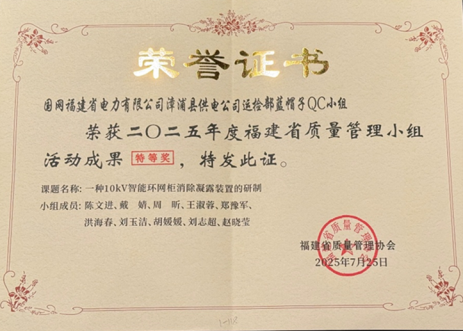 本次大会是全省质量管理成果的年度“大阅兵”,由福建省质量管理协会主办,吸引了全省各行各业近1000个QC成果和信得过班组同场竞技,竞争异常激烈。其中,国网漳浦县供电公司申报的《一种10kV智能环网柜消除凝露装置的研制》,凭借扎实的研究基础、显著的实践成效和出色的现场发布,赢得了评委的高度认可,荣获“特等奖”。这也是国网漳浦县供电公司首次获得该赛事的最高荣誉,标志着其在技术创新与质量管理深度融合方面取得了突破性进展。另一项成果《缩短高压用户计量失准时间》同样表现优异,荣获“一等奖”。