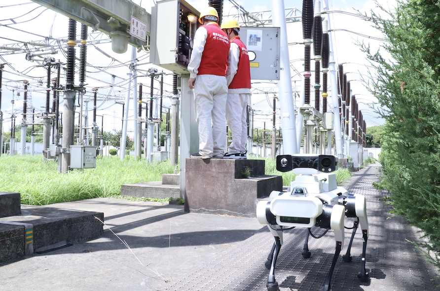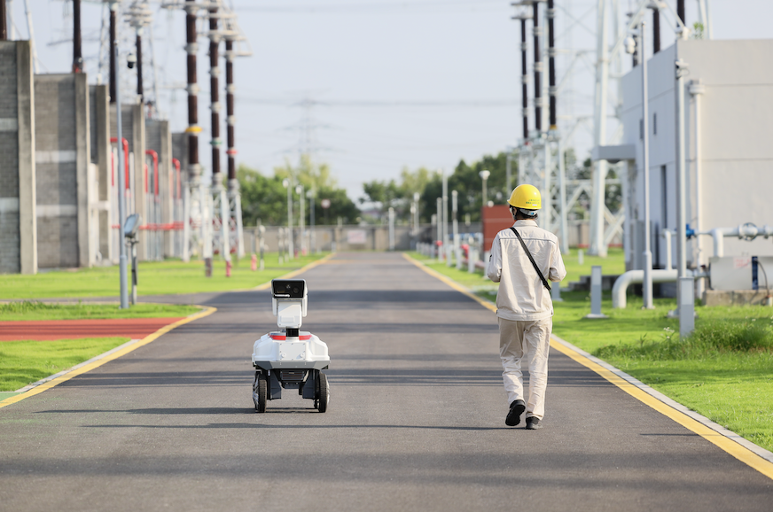 国网上海超高压公司运维人员与“天枢”自主巡检机器狗在500千伏杨高变电站内开展户外设备巡检。