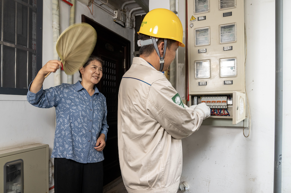 国网上海市北供电公司供服人员来到静安区上工新村,逐栋逐层检查楼道线路,对老旧表箱接头细致开展检测。