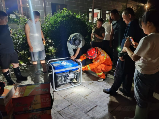 图为7月27日22时,国网北京电力综合应急救援二队付佳文、李静波会同密云公司抢修人员为河北村村委会送去两台发电机作为应急电源使用,并向村民讲解使用方法。李静波 摄
