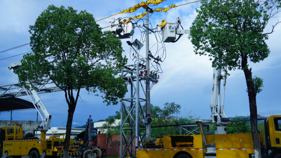 8月5日午后,一场骤雨初歇,邵武市吴家塘工业园区的上空悄然架起一道七色彩虹。在这幅天然画卷下,国网邵武市供电公司的带电作业人员正采用“双车协同”作业方式,为10千伏吴竹线这条园区供电“大动脉”更换新型智能开关。