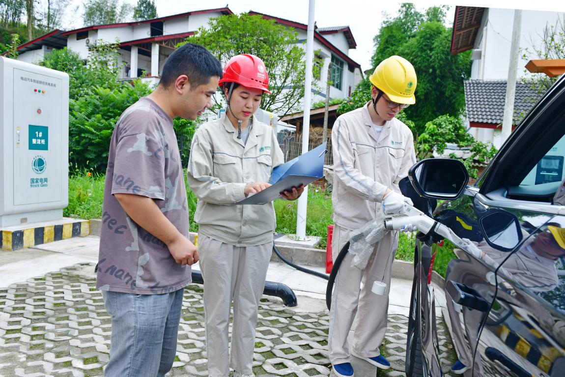 国网重庆合川供电公司员工在弯桥村超级充电站服务车主充电。秦晓东/摄