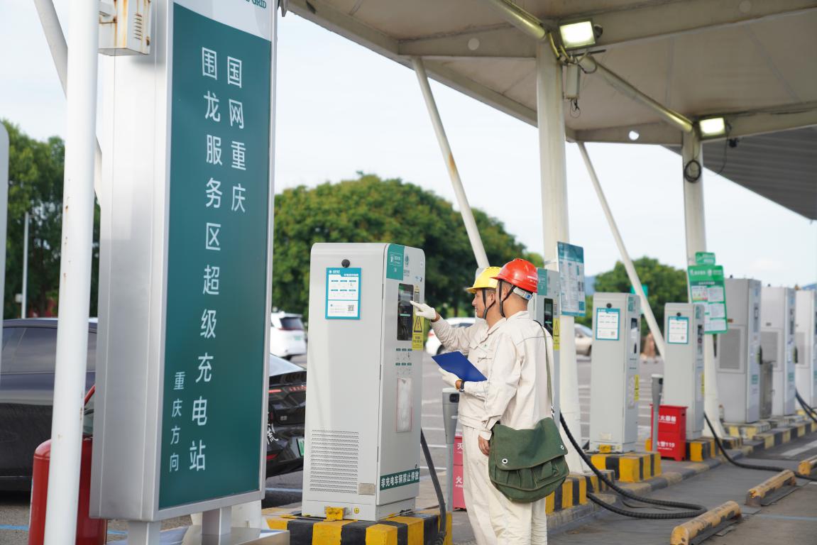 国网重庆铜梁供电公司员工在围龙服务区检查充电桩运行情况。颜玲莉/摄