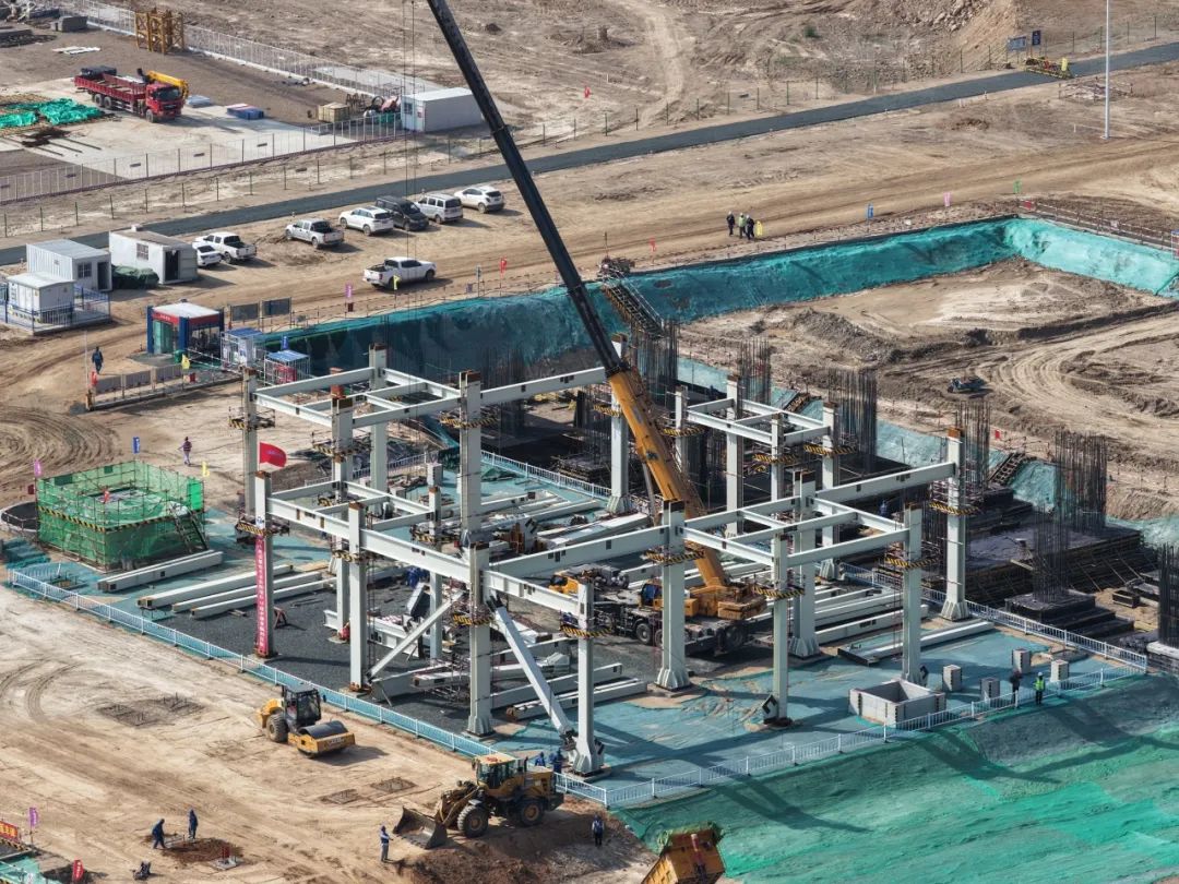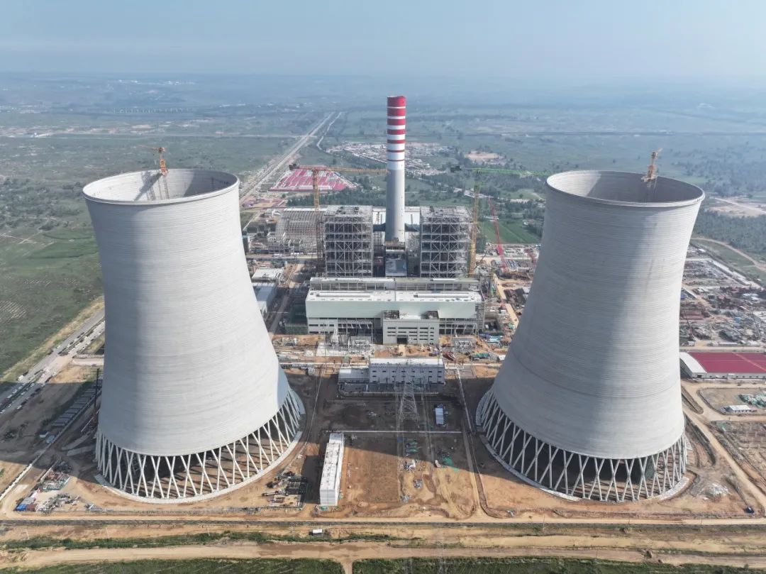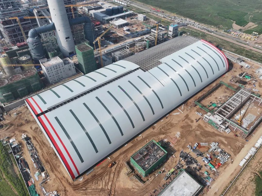 截至目前,1号机主厂房封闭已完成90%,施工人员正在对剩余部分进行最后的收尾,厂房的轮廓愈发的清晰而完整,为后续设备安装提供了稳固的作业空间。1、2号间冷塔全部到顶,两座高耸的间冷塔如同巨人般矗立在厂区,成为整个项目的标志性建筑;条形煤场封闭安装蹄疾步稳,成为厂区亮点工程之一。