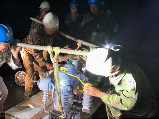 抵达现场后,抢修队快速制定双轨作业方案:一路部署发电车接入临时供电线路,保障居民社区等重点区域基础用电;另一组登上湿滑电杆,在探照灯照射下实施开关更换作业。杆上作业人员身着被雨水浸透的工作服,在斜风细雨中完成拆线、接线等多道工序。因手套被雨水浸透变得沉重,每拧动一颗螺丝都需耗费常规数倍力气,脸上雨水与汗水交织,整个凌晨始终处于高强度作业状态。