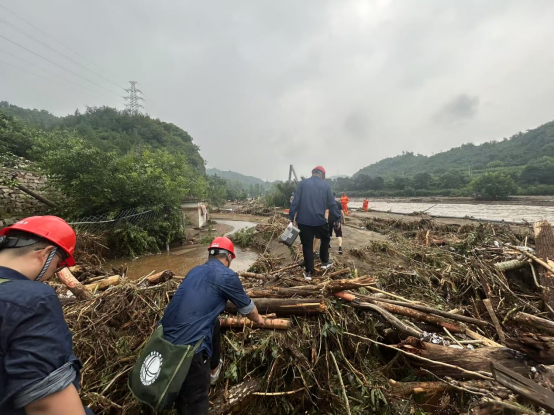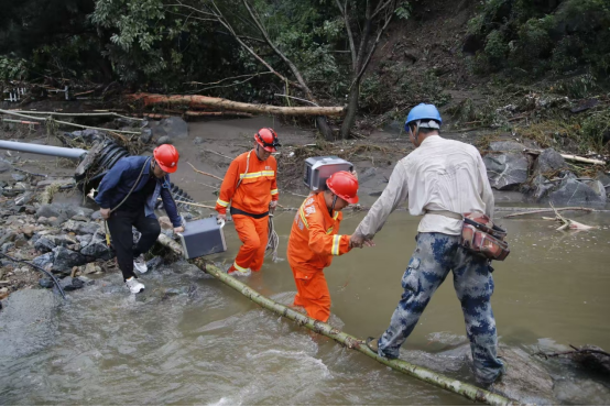 翻过第一座山时,一条宽约4米的河道横亘在面前,坍塌的泥土和石块,在路上堆成了小山,原本温顺的山溪,此刻成了咆哮的“黄色巨龙”。“找水流最缓的地方!”经验丰富的李岩松站在岸边,目光扫过河面,从旁边寻来一根碗口粗的树枝,跨河而架,以减缓水流的速度。队员们排成一字,一人搀扶、一人扛电源,小心翼翼地交替蹚水过河。