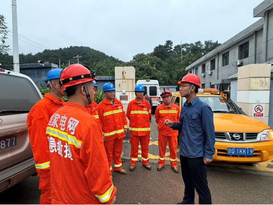 ▲7月27日晚19时35分,国网北京电力应急抢修队伍10余人即将出发前往密云区石城镇,对附近村庄开展应急复电工作,将通过发电车接入方式恢复60余户百姓用电。图为密云现场负责人冯江波正在出发前对抢修人员进行安全措施提示。(李艳娜/摄)