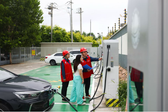 ▲国家电网首都电力(亦庄)共产党员服务队队员在同宁超充站为新能源车主提供充电服务。张庆玉 摄