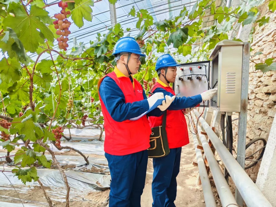 ▲国网山西忻州河曲县供电公司太行黎明共产党员服务队队员在丰禾生态农业有限公司榆岭窊果蔬种植基地进行安全用电检查。张立超/摄
