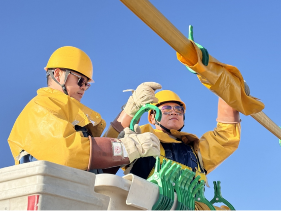 姬福成首先对作业区域的线路、设备开展验电。“C相验电完毕,申请遮蔽!”他将绝缘毯精准覆盖导线。此时,地面红外测温仪显示:斗内体感温度38摄氏度,两人安全帽内衬的吸汗棉条早已浸透。