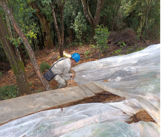 ▲国网邵武市供电公司输电人员对铁塔边坡塌方处用薄膜进行加固。黄磊/摄