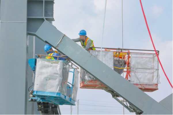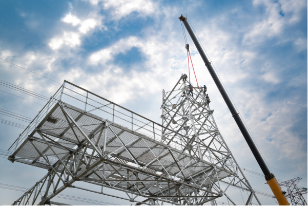 ▲北京电力工程有限公司施工人员开展变电站钢结构吊装作业。 郭航 摄