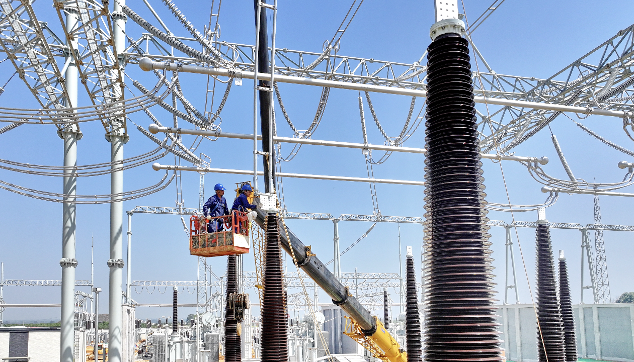 国网四川送变电公司作业人员在成都邛崃500千伏变电站内安装设备。陈翔/摄