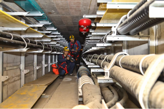 图为6月23日,国网北京电缆公司运维北区一班王硕、吕彪在三里河附近电力隧道内,对中考重点保障线路开展巡视检测,确保主网电缆安全稳定运行。(赵旌朝 摄)