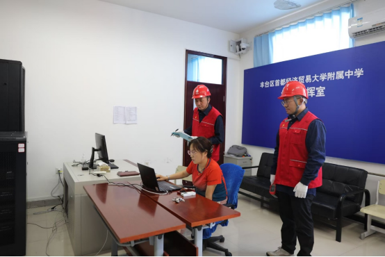 图为6月20日,国网北京丰台供电公司员工陈更、王艺超到中考考点首都经济贸易大学附属中学检查用电设备,保障中考期间用电安全。(陈芳摄)