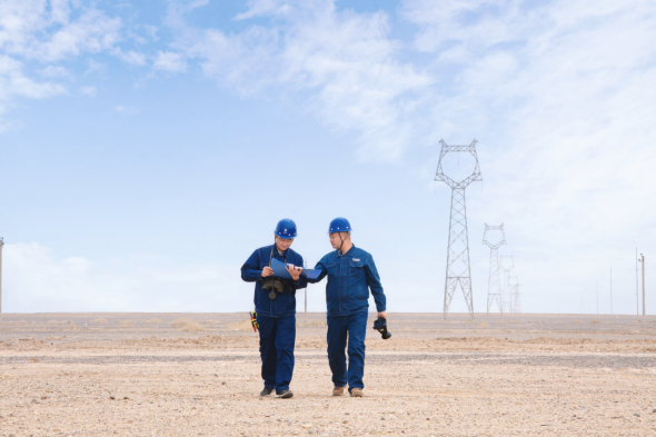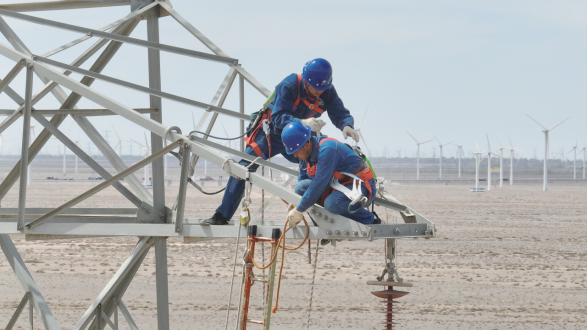 图为国网酒泉供电公司输电运检工作人员邓文龙,肖红佳在330千伏31472玉清I线开展更换绝缘子工作,有效夯实设备本质安全,为新能源外送提供坚实支撑。王娜/摄