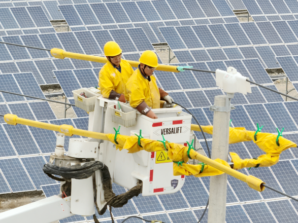 图为国网酒泉供电公司带电作业人员尤磊、郝凯在110kV春华变127春东线138号杆带电搭接隔离开关(刀闸)上引线。 裴勇峰/摄