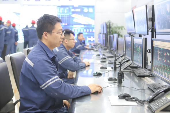▲内蒙古大板发电有限责任公司集控室监盘人员专注监测系统参数,以严谨态度护航机组安全稳定运行。