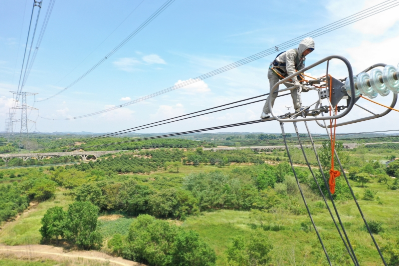 近日,在湖北省荆门市后港镇40多米的高空中,胡洪炜在500千伏安兴一回线路导线开展带电作业,完成受损导线补强工作,保障迎峰度夏期间线路安全稳定运行。今年,胡洪炜已经在湖北超特高压电网带电作业一线工作了25年。