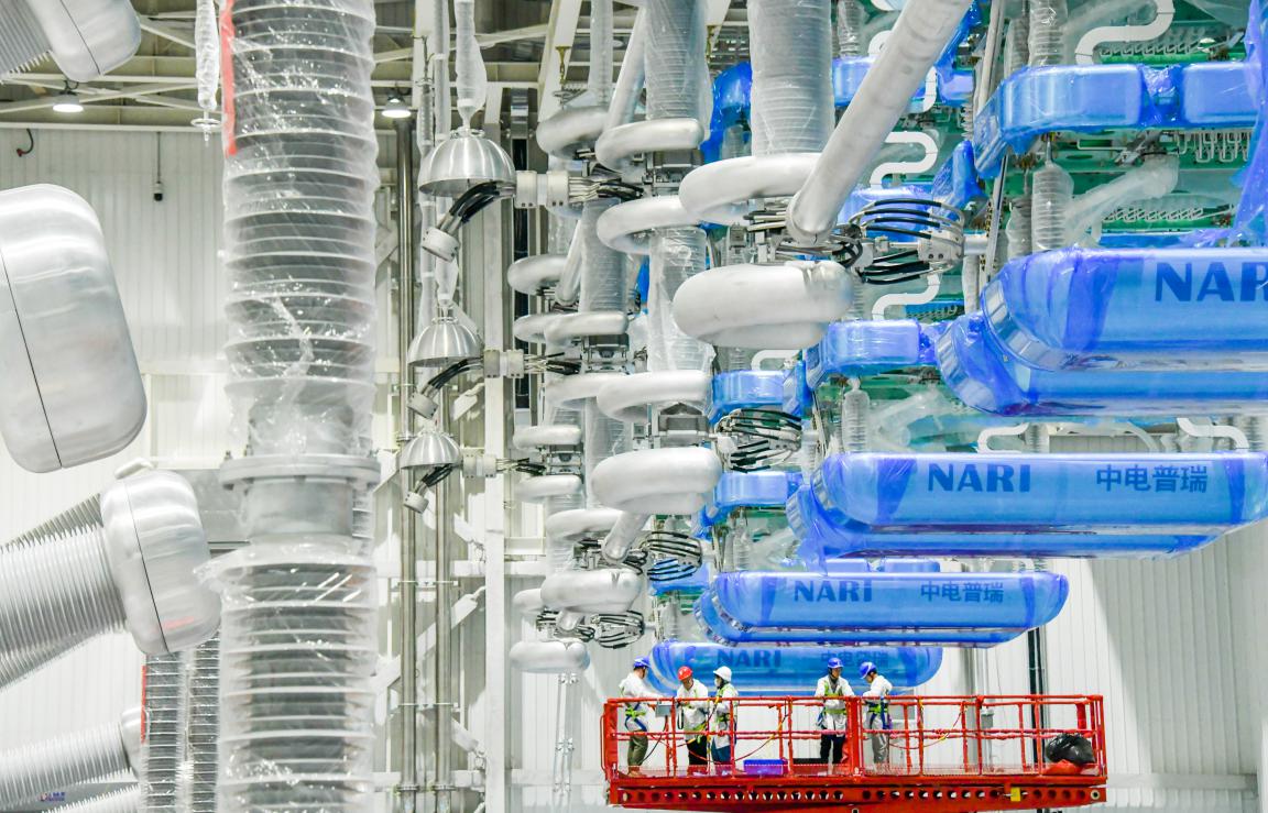 施工人员在“疆电入渝”工程±800千伏渝北换流站安装直流母线。况敏/摄