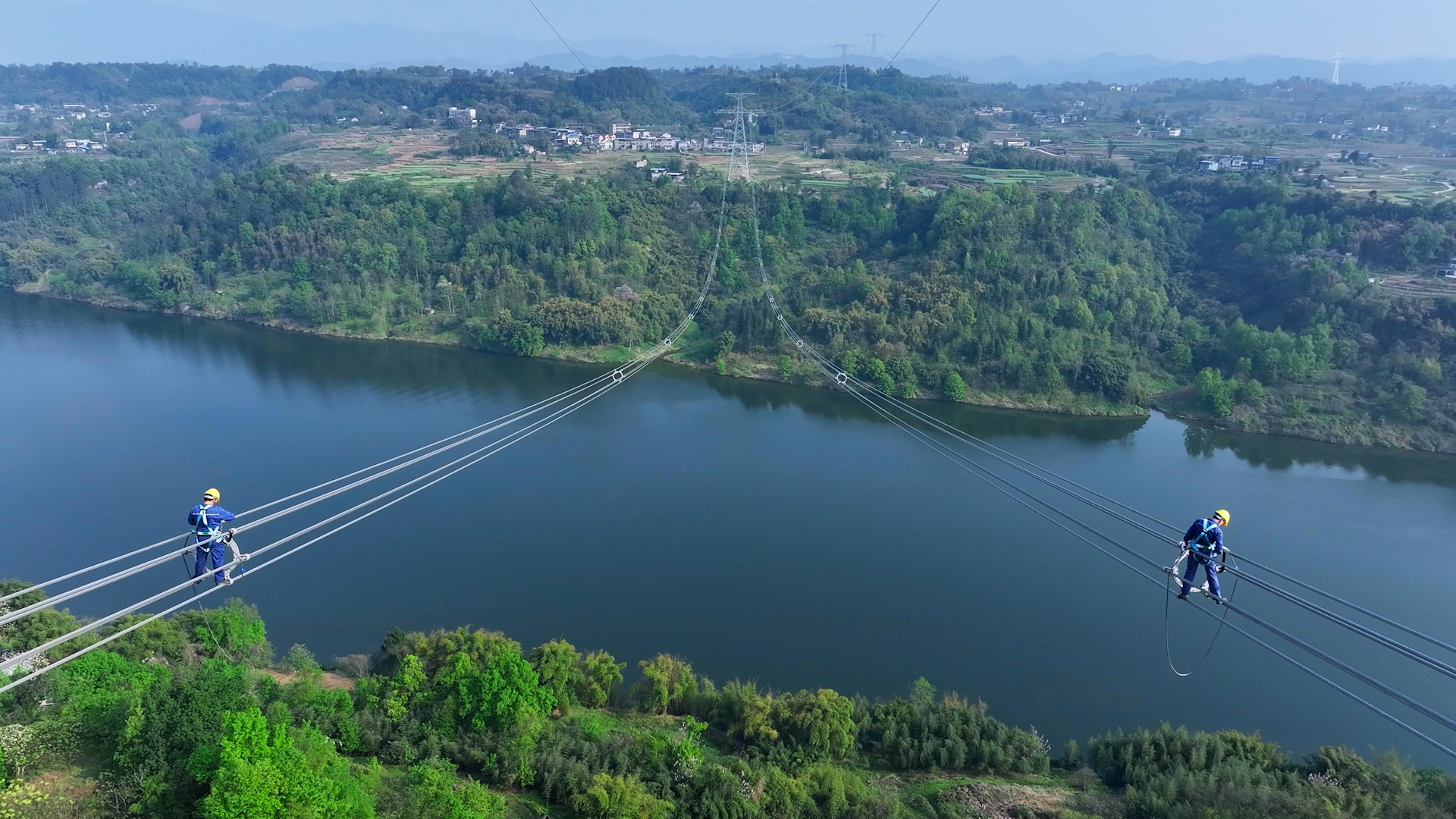 国网重庆超高压公司员工对哈密—重庆±800千伏特高压直流输电工程(重庆段)开展跨江走线验收作业。李涛/摄