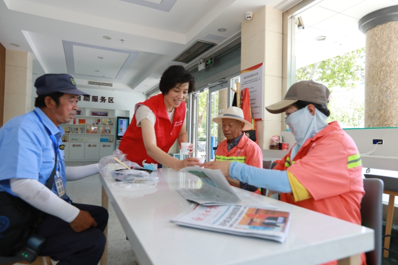 吕明玉在威海市昆明路彩虹驿站为环卫工人送水