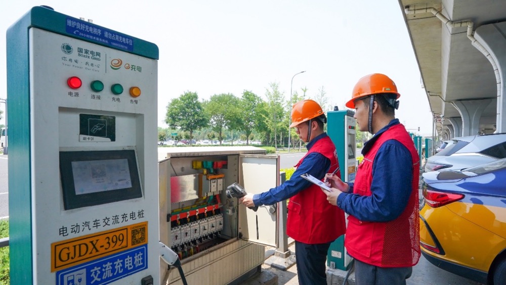▲5月29日,国网北京大兴供电公司机场供电服务中心员工对大兴国际机场1号公共充电站开展巡视测温工作,护航旅客绿色出行。(张章 摄)
