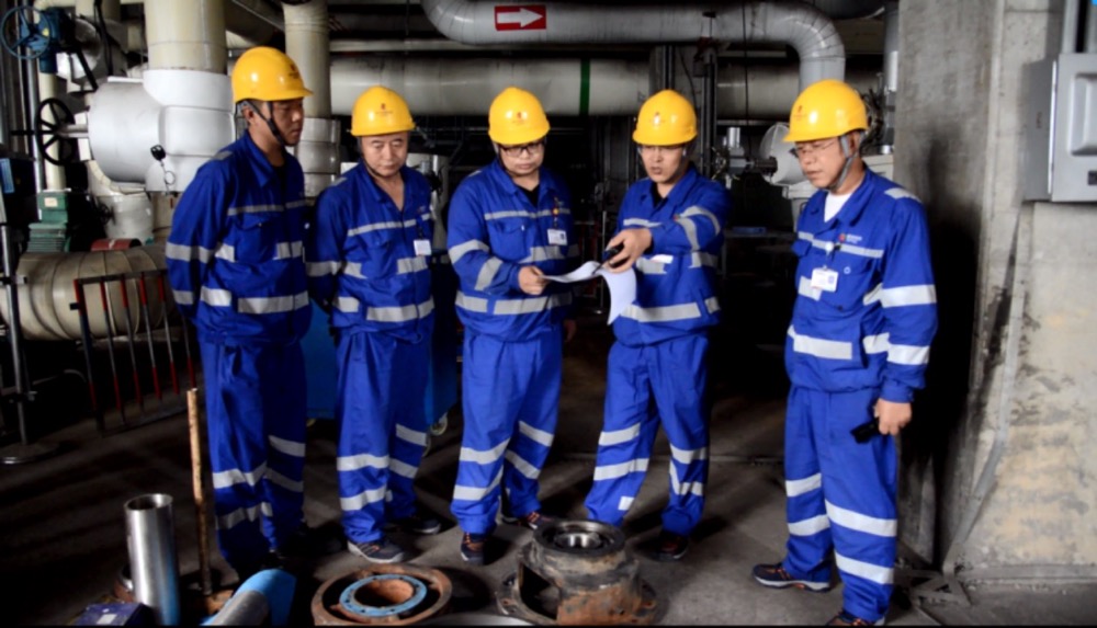 图为张玉忠带领团队成员研究解决热网循环泵振动大问题