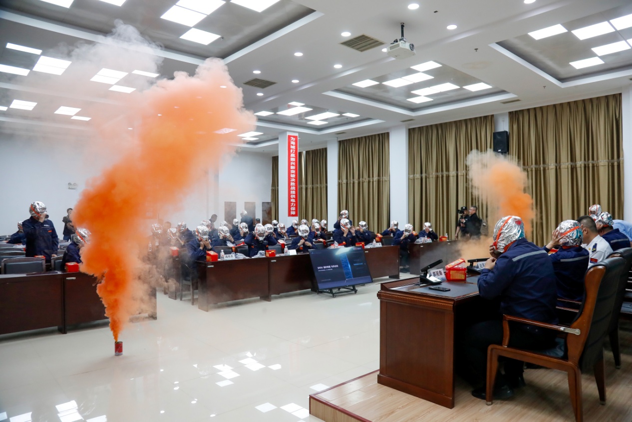 一场紧贴实战的应急逃生演练在理论培训后迅速展开,现场,消防队员通过发烟罐模拟会议室突发火情。浓烟升腾的瞬间,应急响应机制即刻启动,工作人员第一时间报警、汇报火情并引导疏散,参训人员迅速佩戴自救呼吸器弯腰低姿撤离至室外演训场,在紧张有序的氛围中,3分20秒内完成了全员的安全疏散,整个过程环环相扣,检验了应急预案的可操作性。