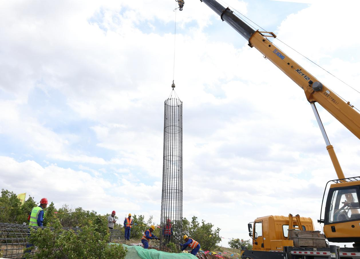 5月19日,在蒙能阿旗-阿旗北500千伏线路工程现场,施工人员正在进行钢筋笼吊装。曹旭/摄