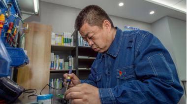 黄新民在焊接电路板。