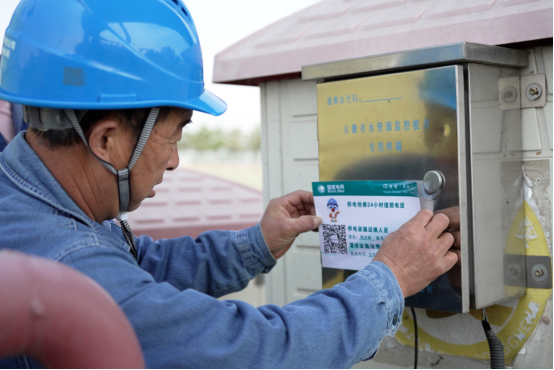 图为4月29日,濉溪县供电公司五沟供电所闫华给庙前村 “扫码灌溉” 设备张贴“设备主人”公示牌。储运涛/摄