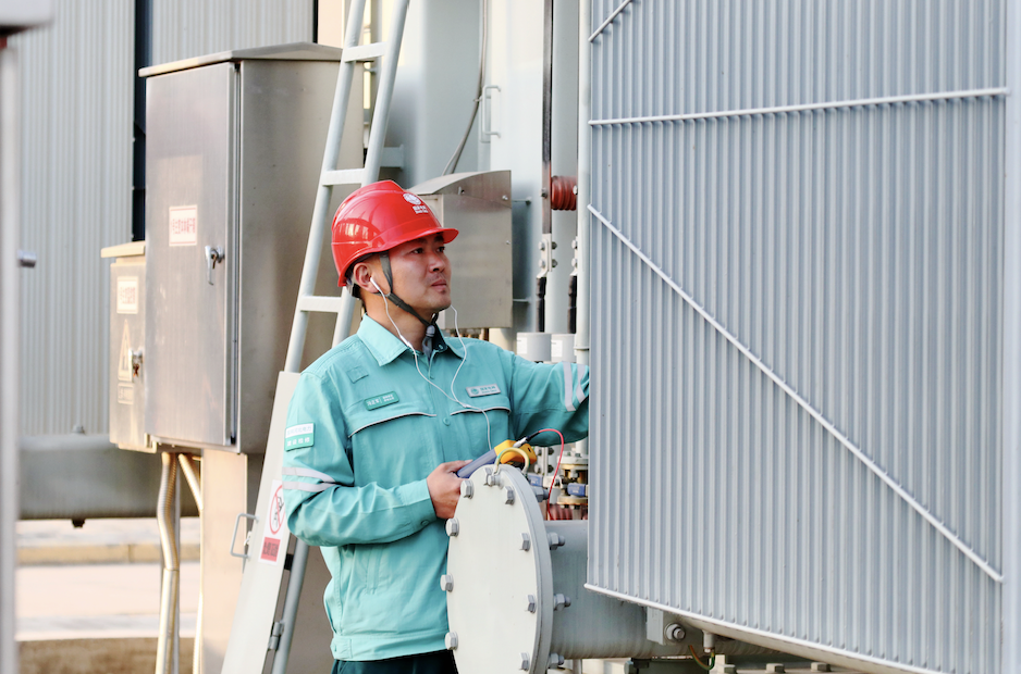 全国劳动模范、国网保定供电公司员工冯正军在变电站例行检修试验现场,为主变压器“体检身体”。刘钟毓/摄