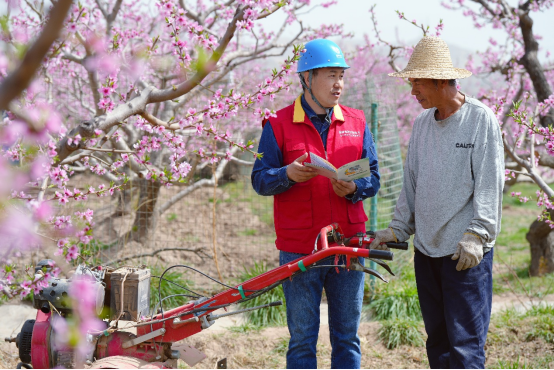 图为国网兰州供电公司安宁供电分公司员工何占琦在安宁堡街道红艺村社区为桃林种植户开展春季安全用电和电费电价政策宣传。史双绚/摄