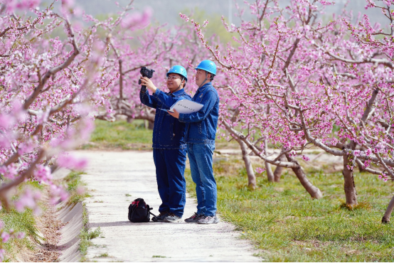 在一树树绚烂的桃花中,供电员工的身影格外醒目。一大早,国网兰州供电公司安宁供电分公司员工马彪和何占琦来到红艺村社区,检查配电变压器和桃园内的用电设施,向客户普及安全用电知识。