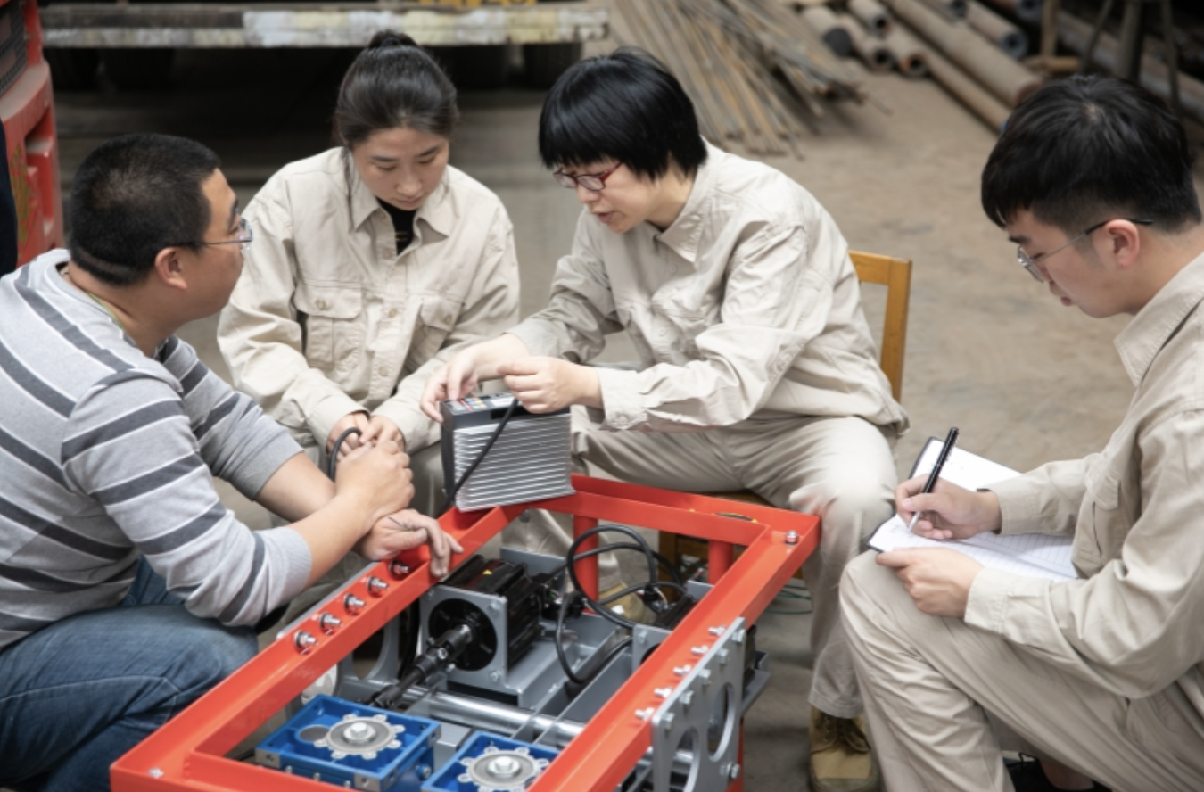 何光华和创新团队成员在进行双模通信集成化同步联控电缆输送机的设备调试。