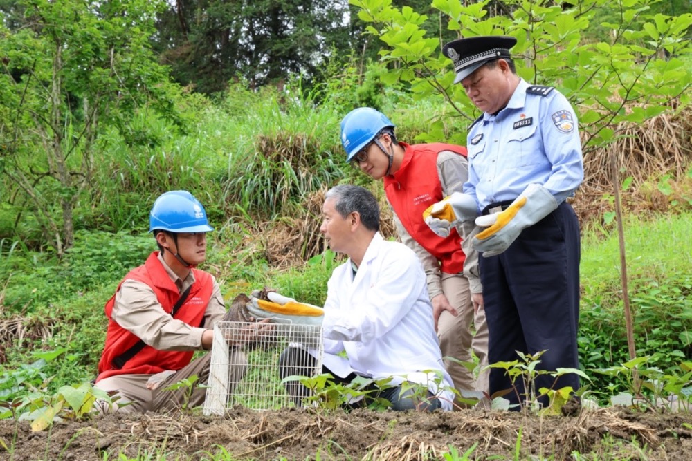 图为当地供电部门员工在野生动物保护站、森林公安共同见证下放生雨后夜巡中救助的国二级保护动物夜鹰。蔡晶/摄